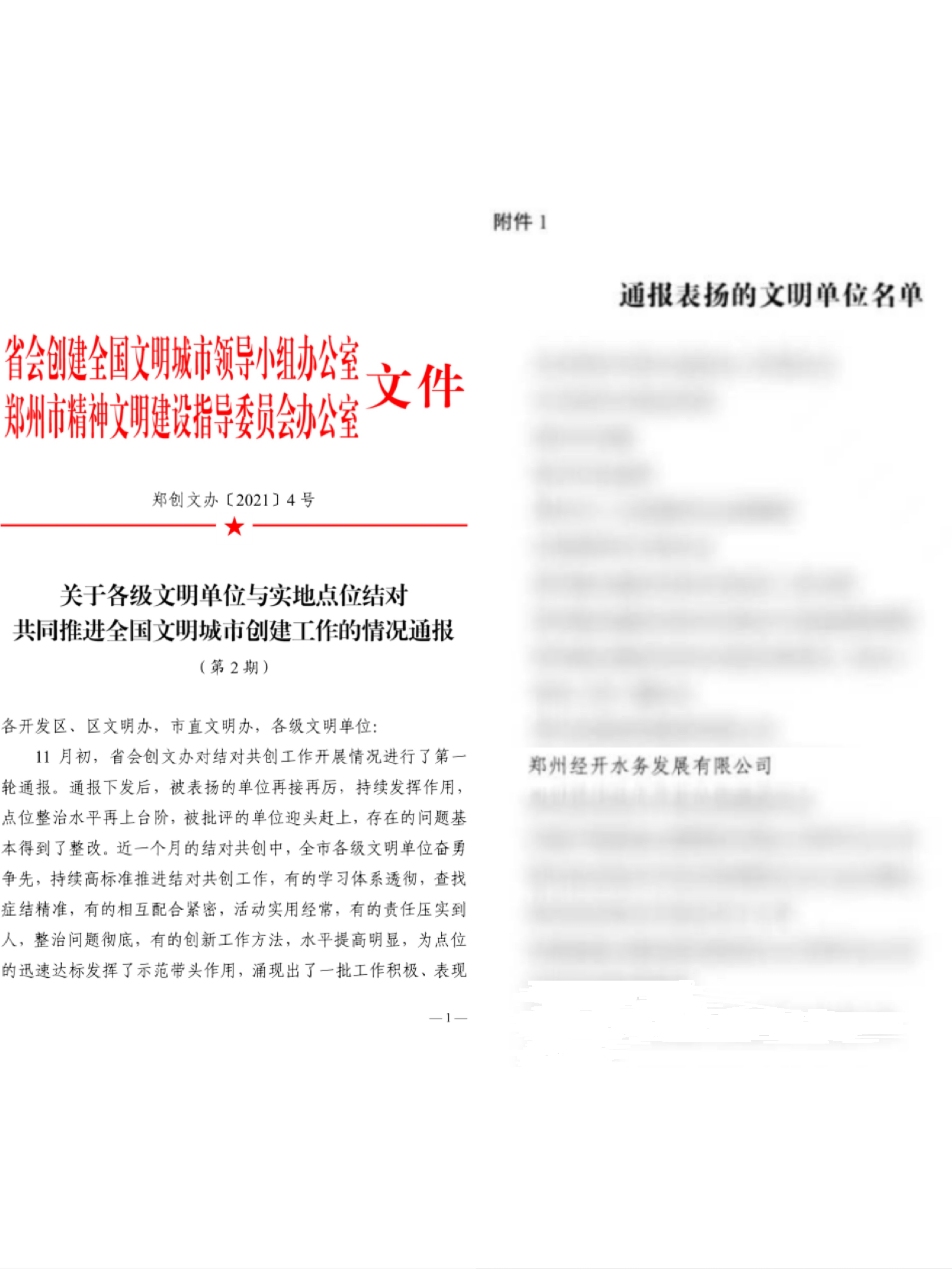 近日,省会创建全国文明城市领导小组办公室、郑州市精神文明建设指导委员会办公室联合下发《关于各级文明单位与实地点位结对共同推进全国文明城市创建工作的情况通报》(郑创文办﹝2021﹞4号),经开水务公司因在创建文明城市结对共创中表现突出,获得全市通报表扬。